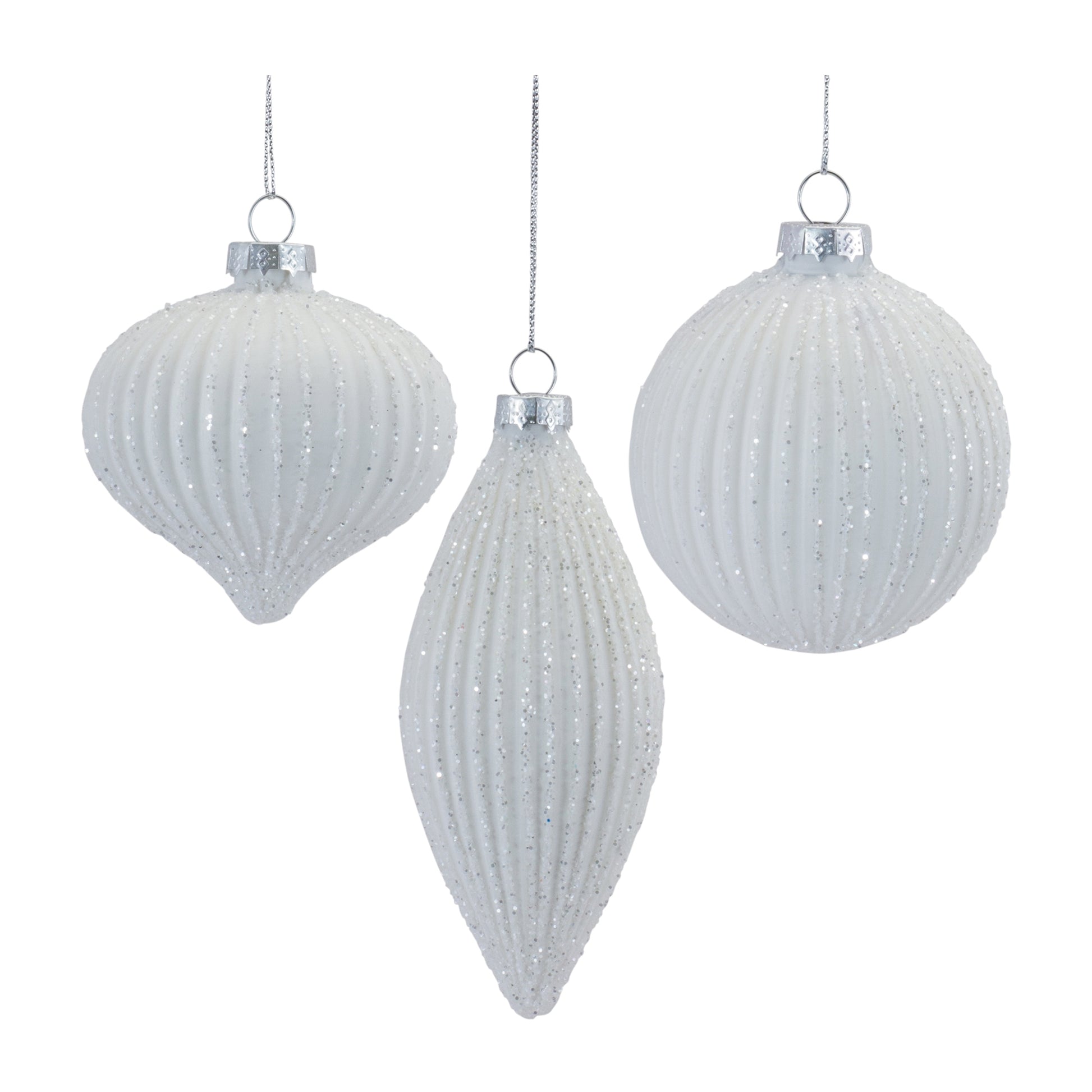 Add a chic touch to your Christmas Tree with this beautiful set of Glitter Ribbed Glass Ornaments. Featuring 12 pieces, this set's chic white and silver tones, traditional ball and onion designs, and glittered accents are the perfect combination to create a memorable display. The quality glass composition with string hanger is sure to endure for seasons to come. Whether you're adding a touch of cheer to your home or gifting to a loved one, these ornaments will definitely bring smiles to your home.