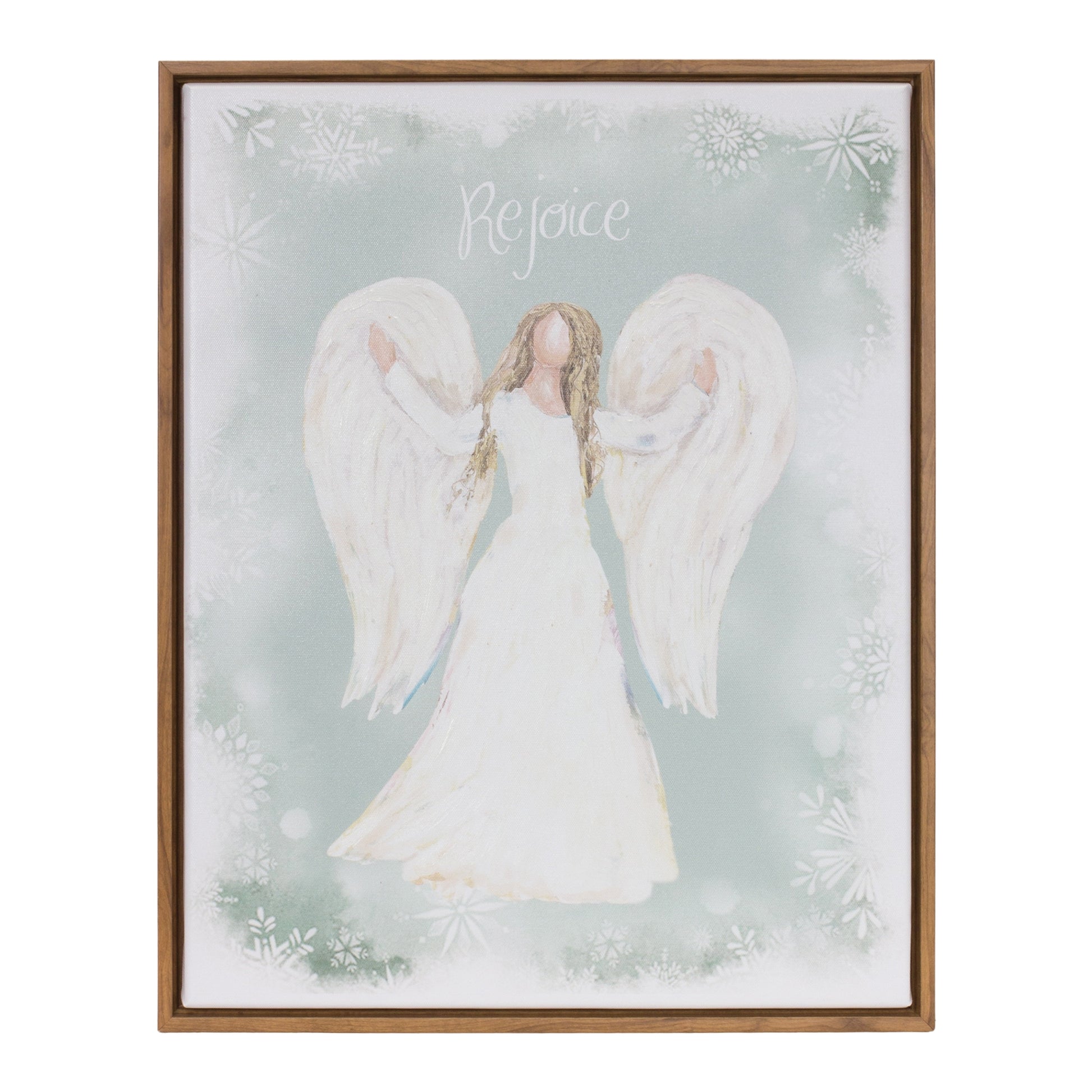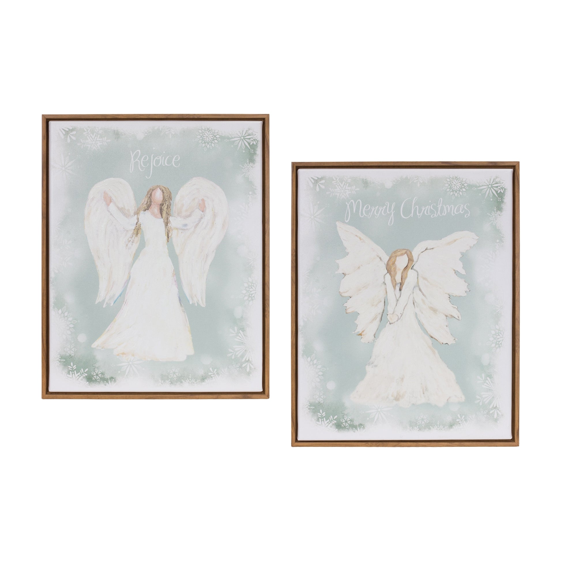 Make the holidays brighter with this set of Winter Angel Wall Art! Featuring an exquisitely painted artwork in wintry blue and white tones, this festive wall decor will transport you to a winter wonderland! Whether it's a gift for a loved one or just an addition to the holiday decorations, the "Rejoice" and "Merry Christmas" sentiment will spread joy and warmth this season. The quality canvas composition with framed wood is sure to last for seasons to come. Get ready for a truly magical holiday with Winter Angel Wall Art!