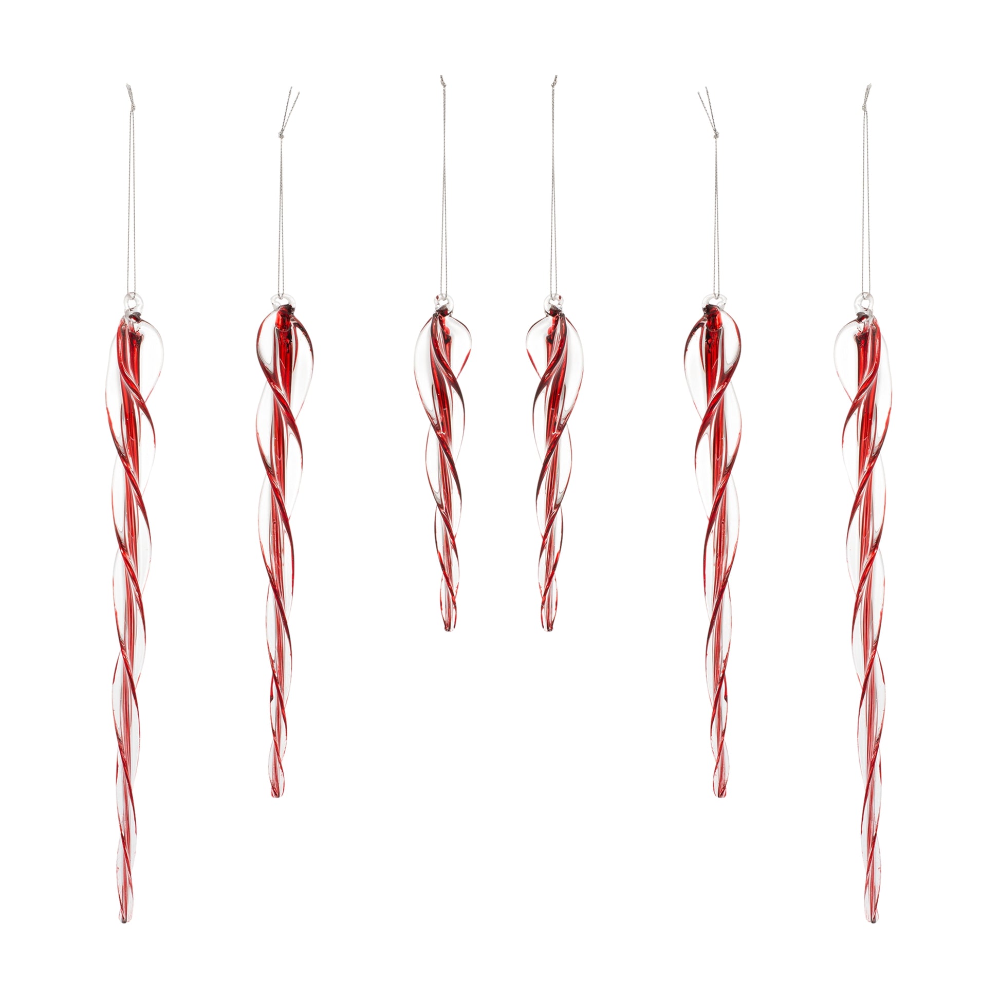 Decorate your Christmas tree with this lovely collection of Icicle Ornaments. The beautiful swirled glass design, along with the brilliant red accent, makes this set the perfect addition to your holiday tree decor.